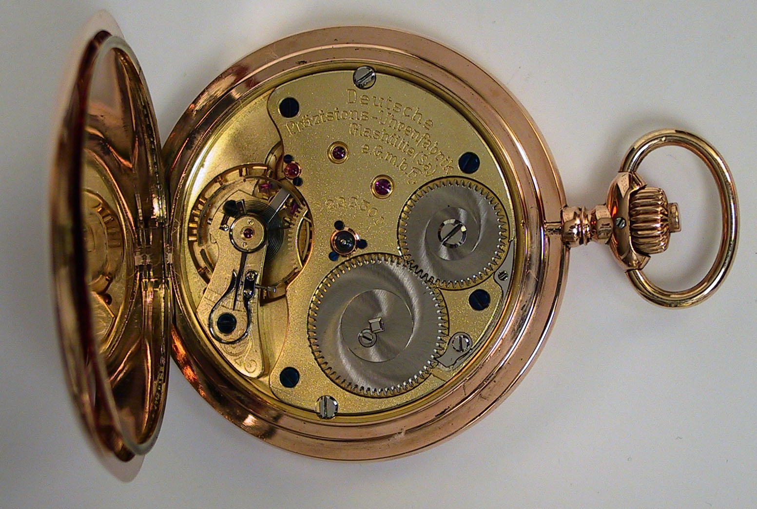 Die Uhren der Deutschen Präzisionsuhrenfabik haben oft einen vergoldeten Metallinnendeckel.